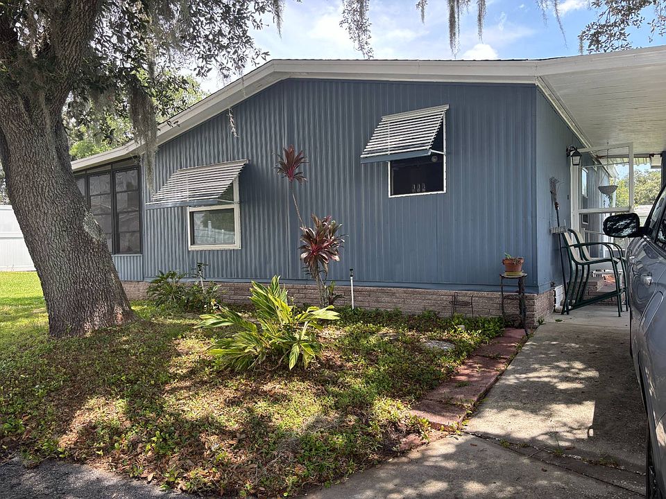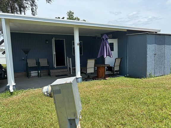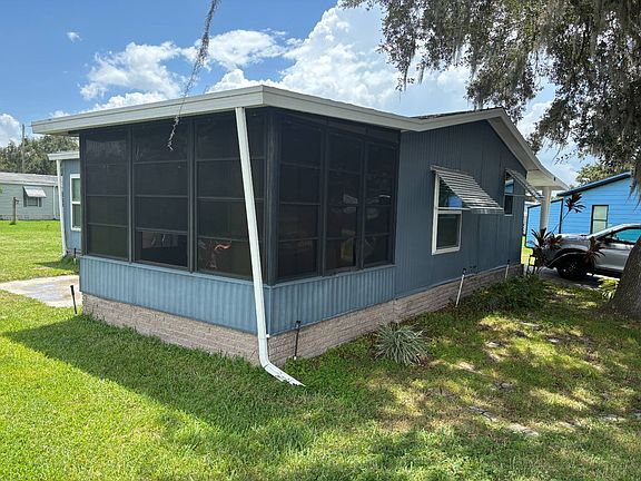 This home is in a beautiful 55+ community park. Huge corner lot with big oak tree for shade and common ground behind. This home is 2 bedroom/2 bathroom, appliance stay. Laminate flooring all through the home. Lanai has vinyl windows, can be used as all season room. Lanai overlooks the common ground. Laundry shed attached to carport with extra storage shed available. Air conditioning was replaced 2023.