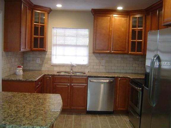 Charming curb appeal and beautifully remodeled throughout. This 3 BR, 2 BA home has ceramic wood style flooring throughout the living area and carpeted bedrooms. It's a split bedroom configuration with the MBR in the rear w/sliding door opening out to the back. The LR opens to the dining-room, kitchen and family room. There is crown molding in LR, DR & FR. The kitchen has been totally re-done & features rich wood cabinets, granite counters a complete SS appliance pkg. There are pocket doors in FR which offers the option of privacy and sliding glass door opening out to a screened patio in the back. There is a GFS Generator system. The rear yard is fenced and has a storage shed and no rear neighbors. Lots of room for pool or to personalize to your taste. Great established neighborhood w/tree-lined streets, community park and lake access. All public services are a short distance and easy access to I-4.