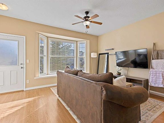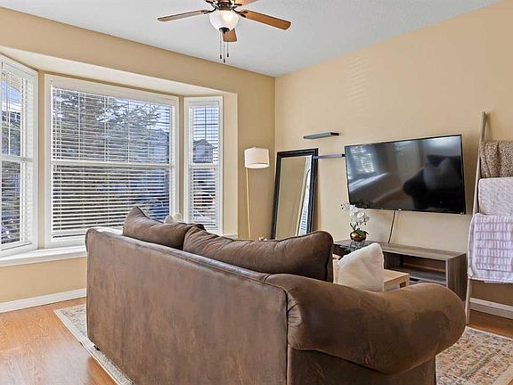 Welcome to this charming end unit townhouse nestled in the sought-after community of Luxstone in Airdrie. This move-in ready home is perfect for first time buyers, young families, or savvy investors, offering incredible value and thoughtful design throughout. Step onto the welcoming front porch, perfect for morning coffee or relaxing evenings, and into a bright, open concept main floor featuring durable laminate flooring throughout. The spacious living room is bathed in natural light from a large south facing bay window, creating a warm and inviting atmosphere. Flowing seamlessly from the living space is a formal dining area, comfortably fitting a table for four with additional room for a coffee station or storage hutch. At the back of the home, you'll find a functional U-shaped kitchen complete with plenty of counter space, a corner walk-in pantry, and an adjacent breakfast nook, perfect for casual meals or working from home. From here you'll have easy access to the backyard which opens directly onto a peaceful communal green space. Upstairs, the spacious primary bedroom features a bright walk-in closet with a window and direct access via a cheater door to the 4-piece bathroom. Two more well-sized bedrooms and a linen closet complete the upper level. The unfinished basement provides ample opportunity to develop a large rec room, home gym, or office space giving you versatility depending on your lifestyle! Additional highlights include two side-by-side parking stalls right out front and a well-managed complex that’s just steps from a playground and within walking distance to a convenient plaza with a gas station, 7-Eleven, medical clinic, pharmacy, and multiple food options. Luxstone is a family-friendly, well-established community known for its walkability, parks, and proximity to schools (W.H Croxford High School, St Martin de Porres High School, Nose Creek Elementary School) and shopping. Living in Airdrie means enjoying small town charm with big city convenience, just minutes from Calgary and the airport, yet offering a quieter, more relaxed lifestyle.