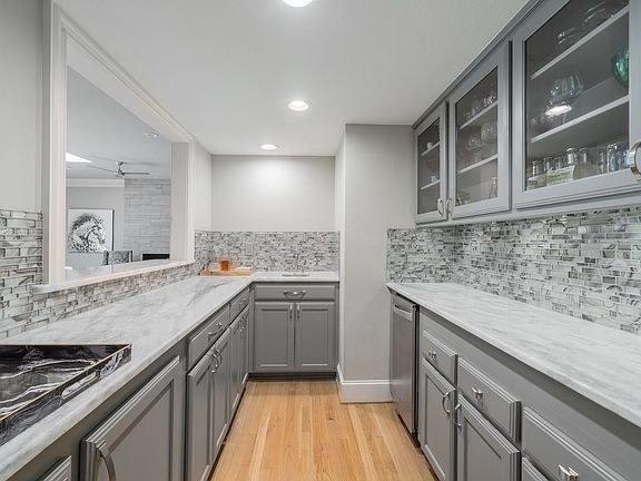 Transitional Remodel Style in Windsor Park - offering 4 beds, 3 living areas, 3 full & 2 powder baths, 2 car attached garage & great outdoor entertaining space; kitchen offers built-in commercial sized refrigerator freezer, double ovens, granite countertops, glass tile backsplash; walk in bar-butlers pantry with ice maker & marble countertops with undermount bar sink - bar serves to den-great for entertaining; den consists of herringbone pattern wood flooring, skylights, gas fireplace boasts floor to ceiling Venetian Marble Tiles & Diamond Fire Glass; West side of house great design for Mother-In-Law Suite or guests privacy; spacious private master bedroom with walk-in closet with built-in drawers & shelves, rain head shower system, bathtub hand sprayer, plenty of storage; white oak wood flooring throughout; marble foyer entry; extended patio, buried power lines, enter garage through wide lane alleyway