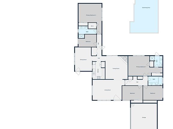 L-shaped floorplanUnique single-story pool homeCorner lotLarge poolDining room