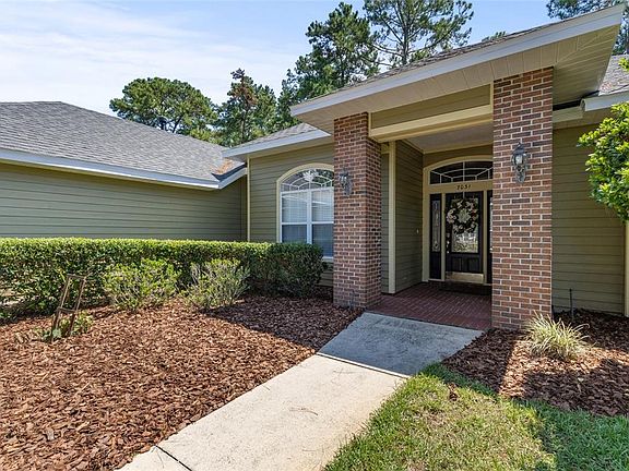 Looking for character and warmth over stark and modern? This Turkey Creek treasure delivers timeless craftsmanship with tall archways, regal wood cabinetry, 10 foot ceilings, charming wall cutouts, and crown molding, all beautifully updated with a new roof (2023), fresh interior and exterior paint, and new landscaping. Your arrival is marked by two stately brick columns framing the front door. Inside, natural light floods through abundant windows, drawing your eyes straight ahead to the living area with elegant built-ins and fireplace. To your left, the formal dining room features a tray ceiling, while just beyond, the kitchen and breakfast nook form the heart of the home. The kitchen’s skylight and wraparound bar, along with the nook’s bay windows overlooking the backyard, make this space bright, airy, and perfect for cooking or casual dining. Through an arched doorway past the dining room, the rest of the home unfolds: a laundry room with garage access, a second bedroom, a guest bath, and a third bedroom, all laid out for convenience, privacy, and flow. At the opposite end of the home, the huge primary suite is a true sanctuary, overlooking the backyard and featuring its own private entrance to the patio. The primary bathroom is generously sized, comparable to one of the other bedrooms, and offers a walk-in shower, Jacuzzi-style tub, and wall-to-wall closet. With tray ceilings, abundant light, and direct backyard access, this suite combines luxury, function, and tranquility. Throughout the home, original hardwood floors and ceramic tile add warmth and durability, while updates like the new roof, fresh paint, and landscaping ensure it’s move-in ready. French doors from the main living space will lead you outside to a 37 feet x 10 feet covered lanai. The fully fenced yard offers plenty of space for pets, gardening, or quiet evenings under the trees. Living in Turkey Creek means enjoying a gated entrance, golf course, clubhouse, pool, tennis and pickleball courts, playground, and walking trails, all just minutes from Gainesville, Alachua, and I-75. If you’re searching for a home with traditional elegance, character, and thoughtful design, this Turkey Creek gem is ready to welcome you home.