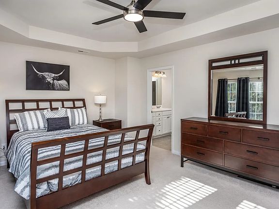 Primary Suite: Upstairs primary bedroom with tray ceiling, ensuite bathroom (double sinks), and a large walk-in closet.