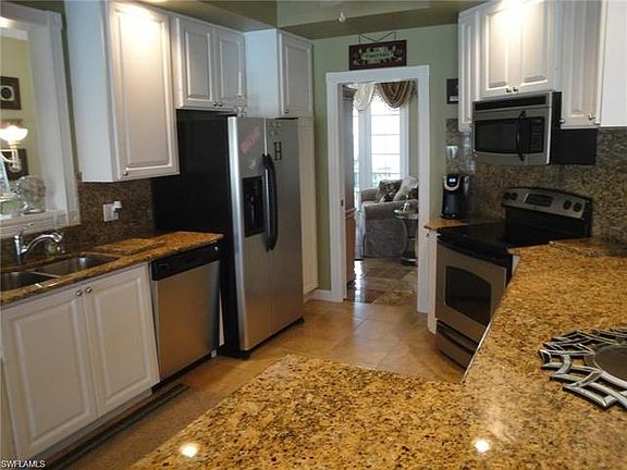 ****** CHECK OUT OUR 3D VIRTUAL TOUR!!! ******Luxurious upgraded Carlyle pool home on the cul-de-sac with poured concrete construction and premium oversized pie-shaped lot. The spectacular upgrades include: Screened front porch, custom crown molding, upgraded porcelain tile, custom ceiling fans with lights, custom sealed garage flooring, outside patio, granite counter-tops, granite backsplash in kitchen, stainless steel appliances, pantry w/ pull out shelves, custom stone pool deck and custom awning, extra-wide driveway, and side patio. Other upgrades include: new pool pump, accordion lanai storm shutter, Living room fireplace with heatalator, custom storage cabinets in garage and water softener. Property super clean move-in condition. VeronaWalk offers: 24/7 guarded gated entrance, over 20 miles hiking/jogging trails, lighted tennis, bocce ball, basketball, pickelball courts, children's play area with equipment, 24/7 fitness center, resort-sized community pool, and lap pool. The Town Center features: Bank, restaurant, hair salon, travel agency, gas station, car wash, post office, library, community rooms, computer center, ballroom, card rooms, and a fulltime activities director.