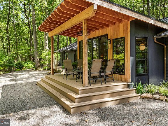 Nestled within the greenery of New Hope, an extraordinary retreat is tucked away- welcome to Moss Hill. This property is a fully revived Mid-Century Modern home, designed by Chris Pickell & Associates, and meticulously renovated in 2024, sparing no expense. Each component of the home was thoughtfully deliberated, merging classic architectural design with state-of-the-art systems, energy-conserving enhancements, and bespoke finishes. The house was stripped down to its bare studs and reconstructed with brand-new electrical systems, high-grade PEX plumbing with manifold, efficient HVAC systems, foam insulation, and superior Marvin Elevate windows and doors. Elegant laminated beams arch the ceilings, while expansive 8' x 12' sliding doors admit an abundance of light and a sense of the outdoors. Modern steel elements, Hardie board siding, a standing-seam metal roof, and Douglas Fir porch features contribute to the home's distinctive curb appeal. Within, the layout is characterized by smooth lines and open spaces. The kitchen, equipped with custom Plato cabinetry constructed from Shou Sugi Ban, a Wolf induction cooktop, a Wolf M Series oven, a Bosch refrigerator, a Fisher Paykel drawer dishwasher, and a bar area with charred wood accents, is the center of the home. A pair of Velux skylights wash the space in natural light, while a stunning wood-burning fireplace with a customized steel surround adds warmth and aesthetic appeal. Every room exudes luxury and thoughtful design. Mirage white oak engineered floors extend throughout the home. The bathrooms provide an experience akin to a luxury spa, with Grohe curb-less showers, heated floors, Robern anti-fog mirrors, towel warmers, and Japanese-style bidet toilets. The master bath is a haven of tranquility, while a unique stone Japanese soaking tub is a highlight of the guest bath. Custom-designed closets by Closet Works add to the home's appeal. In terms of technology and convenience, the home is equipped with a whole-house WiFi system, Honeywell smart thermostat, Bosch high-efficiency heat pump, Briggs & Stratton whole-house generator, reverse osmosis filtration, and a Bradford White heat pump water heater. Soundproofing and insulation were also upgraded beyond standard. The in-house and outdoor living experiences at Moss Hill are equally impressive. Several Azek composite decks extend from the living room and master suite, overlooking panoramic woodland views. A spacious bluestone patio with integrated drainage, newly landscaped grounds, and bold boulder features create an ideal environment for entertaining. The completely renovated gunite swimming pool (2025) boasts new systems, stone decking, and a revitalized pool house with a privacy screen and deck. Moss Hill's prime location is just minutes away from boutique shopping, exquisite dining, river activities, The Bucks County Playhouse, and is an easy 80-minute drive from NYC and an hour from Philadelphia. Combining the charm of mid-century modern architecture with modern efficiency, sustainability, and luxury, Moss Hill offers a unique living experience in an organically peaceful & private setting.