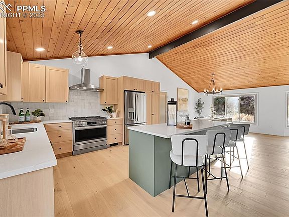 In the heart of Rockrimmon, this updated home blends architectural character with modern design. The entry opens to a vaulted great room with exposed beams, and wide-plank engineered wood floors. A dual-sided brick wall separates the entry and living space, featuring a fireplace on one side and a wood-burning stove on the other. The open floor plan connects the great room, living room, dining area, and a gourmet kitchen with a six-burner gas range, quartz countertops, custom cabinetry and tilework — perfect for gatherings or everyday living. Three bedrooms and two baths are on the main level, including a private primary suite with attached bath. The finished basement adds a fourth bedroom, full bath, laundry, and spacious family room. Outside, enjoy the wood deck, mature trees, and a fully enclosed section ideal for pets or outdoor living. The oversized garage provides extra storage and parking. Close to trails, shopping, and D-20 schools. Updates Include: New roof, electrical panel, engineered hardwood flooring, carpet, kitchen cabinets, quartz counters, tile backsplash, appliances, interior and exterior paint, bath tile and vanities, plumbing fixtures, electrical fixtures, doors, and trim. All information deemed reliable but not guaranteed. Buyer and buyer’s agent to verify.