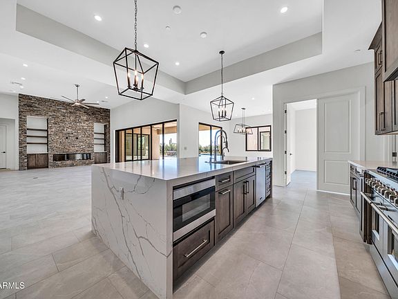 Stunning new luxury estate on 2+ acres with a private guest casita. This custom 4 bed, 3.5 bath home features a refined split floorplan, soaring ceilings, designer lighting, and a multi-panel sliding glass wall opening to a resort-style backyard. The chef's kitchen offers custom cabinetry, premium appliances, oversized island, and a butler's pantry. The primary suite includes a sitting area, spa bath with walk-in wet room with shower, freestanding tub, and large custom closet. Outdoors enjoy a sparkling pool, water feature, travertine patios, and covered living. Epoxy 4-car garage with room to add an RV garage or toy barn. Casita includes 1 bed, 1 bath, living area, and kitchenette. Surrounded by saguaros and mountain views.