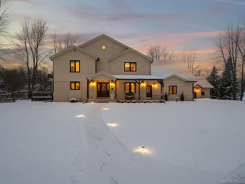 Stunning fully renovated 2 story estate on 6 private acres in the highly sought after Romeo School District! This exceptional home offers the perfect blend of luxury, functionality, and energy efficiency with a solar panel system providing extremely low electric bills. Step inside to find all new flooring, updated moldings, upgraded lighting, and a beautifully remodeled interior throughout. The spacious great room features a dual sided fireplace shared with the dining room, perfect for entertaining and cozy evenings. The kitchen boasts new cabinetry, countertops, and all brand-new appliances including double oven, island microwave, and custom built-in pantry. Enjoy the convenience of first floor laundry and an attached 3 car garage. Retreat to the luxurious owner's suite featuring a private fireplace and a fully renovated spa like bathroom. With 4 bedrooms and 3 full bathrooms, there’s space for everyone. The finished basement is an entertainer’s dream with a custom bar and a one of a kind two story kids playhouse. Outdoor living shines with a brand new patio and gazebo, fresh landscaping, and a versatile pole barn with camper hookup. Additional updates include new windows, sliding doors, furnace, hot water heater, water softener, reverse osmosis system, upgraded electrical panel, and more. Natural gas heat, thoughtful upgrades throughout, and move in ready condition make this home truly exceptional. A rare opportunity to own a luxury property with acreage, modern upgrades, and unmatched amenities!