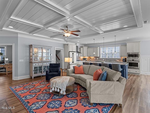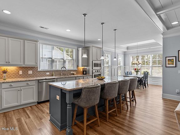 From the charming front porch with swing to the Hardie plank siding, this home shines with curb appeal. Inside, enjoy enhanced crown molding, 7.5'' baseboards, bull-nose drywall, and elegant wainscoting. The spacious living room features built-ins, a gas fireplace, recessed lighting, coffered ceiling, and abundant natural light.