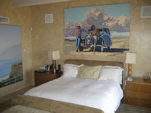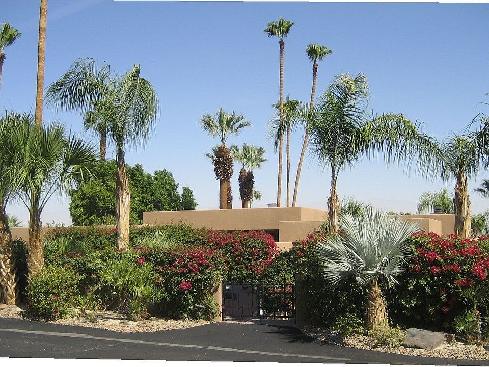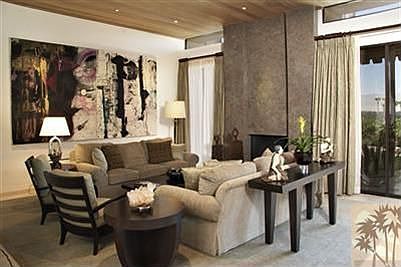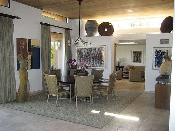 Thunderbird Heights, updated, private, one story, panoramic view home oasis. Enter through gates flanked by a grove of dramatically up lighted palms to the porte cochere where tall glass paned double doors provide a glimpse of the sweeping views across the Coachella Valley toward the extraordinary ever changing shadow play on the Chocolate Mountains. From the generous entry hall flow into the large scale great room featuring high wood ceilings, a wood burning fireplace, wet bar, dining area and walls of glass opening to a patio with views, a built-in BBQ, and overlooking the sizable sparkling pool surrounded by a lush flat green lawn. All principal rooms, plus the master suite, are situated on the spectacular expansive views. A perfect home for entertaining on a large scale or more intimate gatherings. The updated gourmet eat-in kitchen offers top of the line appliances, custom cabinetry, a long breakfast bar, plus breakfast area, a pantry and is augmented by a comfortable den with wood burning fireplace. A spacious master suite features high beamed ceilings, an updated spa like bath with double vanity and a sumptuous soaking tub, walk-in closet, and the in ground outdoor spa on the view is only steps away. The remodeled saline pool and spa are complemented by desert landscape featuring dramatic exterior LED lighting. The home also offers 3 additional ensuite bedrooms, a powder room, travertine and granite floors throughout, fantastic walls for art, numerous skylights, 2 car garage with golf cart area, newer dual zone HVAC, newer roof, 2 tankless water heaters, newer ceiling fans. 4th BR is maid's room with private entrance, currently being used as a home office.
