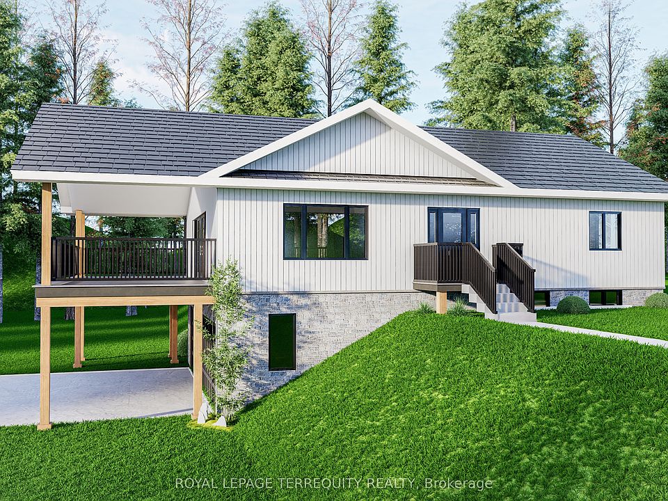 Customize your dream home before completion! This brand-new bungalow with ICF foundation, to be built on a picturesque 0.58-acre lot, offers the perfect blend of modern design and natural beauty. Featuring 2+1 bedrooms and three baths, this thoughtfully designed home showcases open-concept living with large windows that fill the space with natural light. The gourmet kitchen includes a centre island and flows effortlessly into the living and dining area, complete with an elegant electric fireplace and walkout to a covered deck overlooking the treed lot. The lower level provides a bright, finished walkout basement with an additional bedroom, full bath, and flexible living space ideal for guests, family, or a home office. A spacious three-car attached garage with a man door provides plenty of room for vehicles, tools, and storage, insulated with rough in for heat. Surrounded by mature trees and natural green space, this property offers peace and privacy just minutes from Rice Lake and local amenities. Whether you're looking for a full-time residence or a retreat from city life, this stunning new build can truly be the home of your dreams. Renderings are for illustration purposes only and may not reflect the final finishes, features, or layout of the completed home.