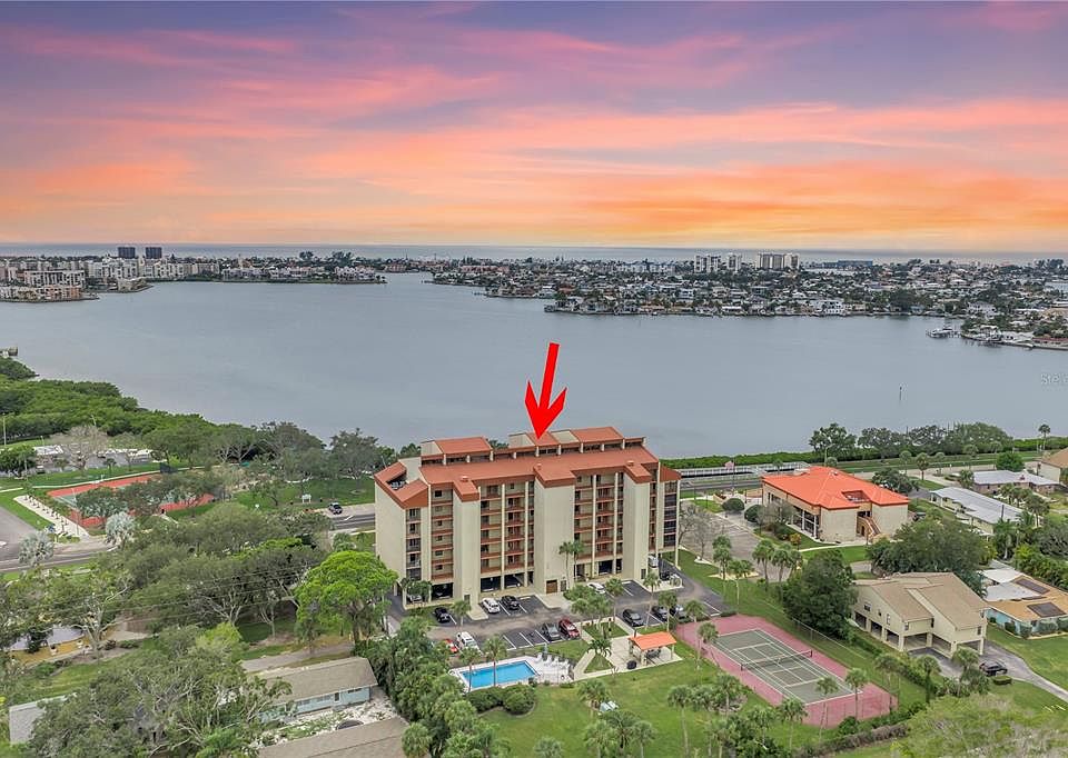 Welcome to your top-floor corner residence with breathtaking panoramic views of Boca Ciega Bay and nightly sunsets from two private balconies. This light-filled 2-bed, 2-bath home features tile flooring throughout, a laundry closet off the kitchen, hurricane shutters on the lanai, and covered parking space #61 with additional guest parking available. Enjoy resort-style living in a secure and pet-friendly community offering a waterfront pool, tennis courts, and a secured lobby. Ideally located just minutes to the Gulf beaches, waterfront parks, shopping, and only 10–15 minutes to vibrant downtown St. Petersburg, this condo offers the perfect blend of waterfront serenity and convenience. Experience the ultimate Florida lifestyle—relax by the pool, play tennis, and take in stunning sunsets over the bay. Priced to sell