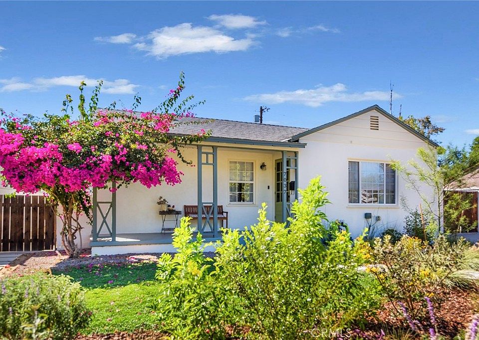 explode with color each spring to the warm, light-filled living spaces inside. There is a spacious living room & dining area that leads to the updated kitchen with granite counters & newer premium stove. The primary bedroom comes complete with beautiful tile floors, new custom closets and a private entrance leading to the enchanting back yard. This house has two completely renovated bathrooms each designed with style, high quality fixtures and love. There is newer tasteful laminate flooring in the living room, kitchen, laundry room and bedrooms that creates a sense of flow and simplicity throughout. There is also newer interior & exterior paint. Your family will love hanging out in the warm, cozy den with large open sliding doors that looks out to the entertainer’s covered patio and backyard. Stepping out to the spacious backyard with lush, mature landscape you will feel you are in a serene garden oasis. The backyard also offers two storage sheds. Additional amenities include copper plumbing, recessed lighting, updated dual pane windows & a home EV charging station. Situated in an excellent Reseda neighborhood adjacent to Lake Balboa and just two blocks to Gault Street Elementary School.