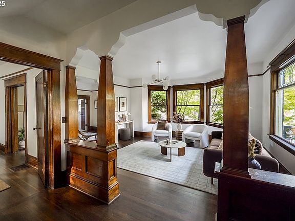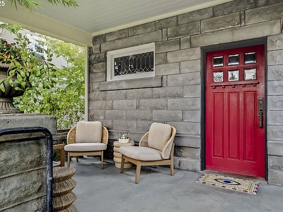 Prepare to be beguiled! This gorgeous corner lot foursquare is a true vision, emerging from a picturesque frontage replete with flowering fruit trees, and encased in a wraparound porch that reads like a Southern belle’s dream. Tall ceilings, large windows that beckon natural light, and rich, original woodwork unite, creating a magical air of enchantment. A large living area connects to an open study, and the formal dining room echoes with the memories of countless joyful celebratory meals. The spacious kitchen has a bonus butler’s pantry (just like you’ve always wanted), and there’s the convenience of a full - and adorably vintage - bath on this level. Upstairs, three generously sized bedrooms, including a beautiful primary bedroom with walk-in closet. The full bath is simply divine: clawfoot tub, custom hex tile, and awash with lovely, gentle light. Extensively updated without losing an inch of soul, the reward being the best of all worlds. Leaded glass windows, Rejuvenation and Schoolhouse fixtures, uniquely detailed archways, picture-rails...the list is deliciously exhaustive. And a bonus office space hides a nifty secret: a stairway to an attic that’s abuzz with potential, already pre-plumbed and wired for whatever your imagination desires. Plus the large, unfinished basement holds similar promise for expansion. A cornucopia of thoughtfully curated flora on the grounds promises a serene sanctuary, inside and out. Located in a special community with neighborly feels and amenity perks, this home speaks to the heart with familiarity and warmth. [Home Energy Score = 1. HES Report at https://rpt.greenbuildingregistry.com/hes/OR10234431]