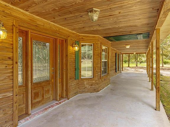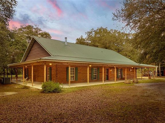 Acadian-style log cabin situated on 6.84 fully fenced acres, complete with two gated entries situated at an elevation of 43.64 feet. This retreat offers 2,883 sq. ft. of cozy spacious living, with an impressive 5,289 sq. ft. under beam including wrap-around porches, great for relaxing and entertaining. Step inside to find an open floor plan featuring a spacious kitchen with ample cabinets & a huge wraparound breakfast offering amazing space for all of your family & friends gatherings. The inviting living room boasts a charming stone corner fireplace featuring soaring ceilings. You will also find a built-in aquarium that adds a unique touch of tranquility. The primary bedroom includes a luxurious ensuite bath with a Jacuzzi tub and separate shower. You’ll love the rich hardwood floors and custom woodwork throughout, crafted from trees milled right from the property itself. Outside, nature flourishes with magnificent oak trees, a chicken coop, greenhouse, an above-ground pool, a treehouse, zip line, blueberry bushes, satsuma trees, cooking pear trees, and several other fruit tree varieties. Entire home is complete with working storm shutters. A well-built pole barn with three lean-tos provides additional storage.