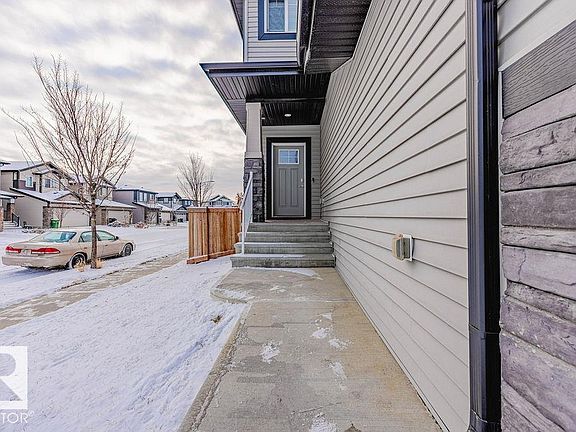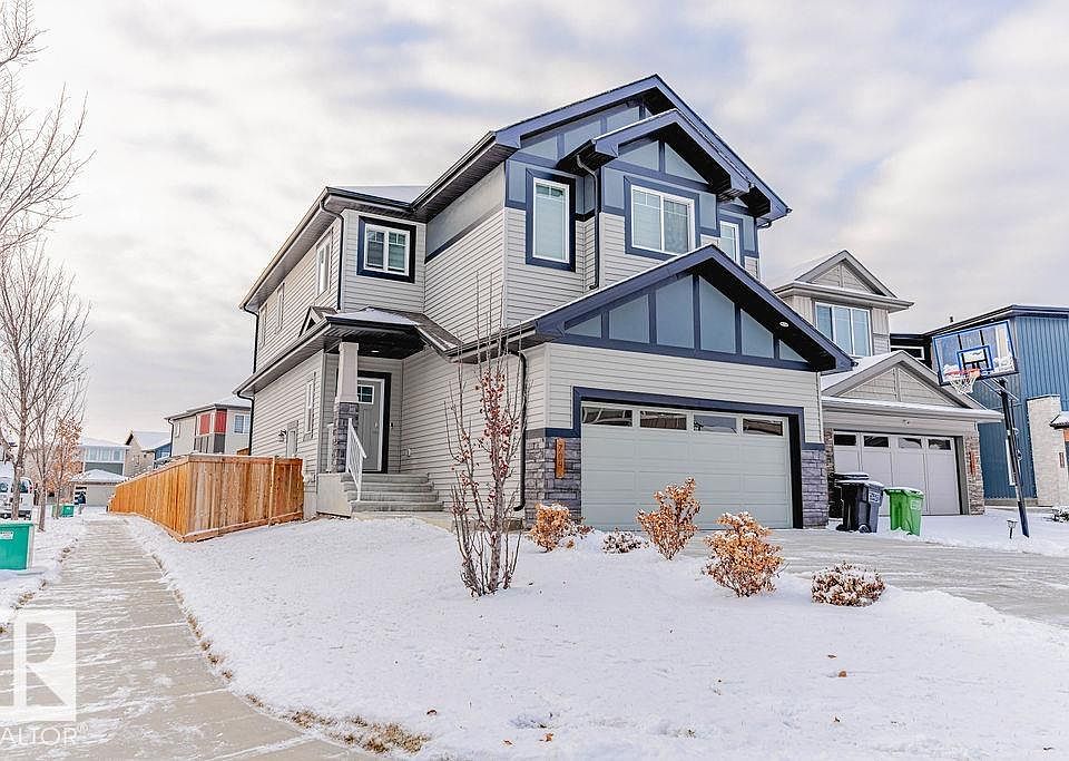 Beautiful 2,107 sq. ft. two-storey home featuring a double attached garage and a separate side entrance to the basement. Ideally located close to schools, parks, shopping, transit, and the Anthony Henday, this home offers both comfort and convenience. The main floor boasts a bright, open-concept design with a dream kitchen complete with a large center island, quartz countertops, stainless steel appliances, an elegant backsplash, and a walk-through pantry. A spacious breakfast nook overlooks the yard, and the inviting living room with gas fireplace creates the perfect space for relaxing. A convenient 2-piece powder room completes the main level. Upstairs, you’ll find three generous bedrooms, including a stunning primary suite with a his-and-her shower and walk-in closet. The upper floor also features laundry and a large bonus room—ideal for movie nights or family gatherings. The unspoiled basement with side entrance offers excellent potential for future development or a secondary suite.