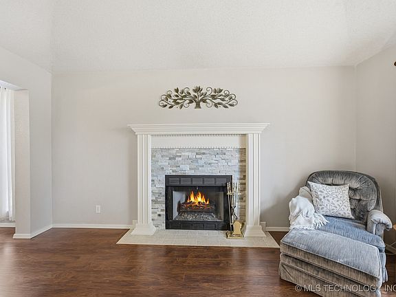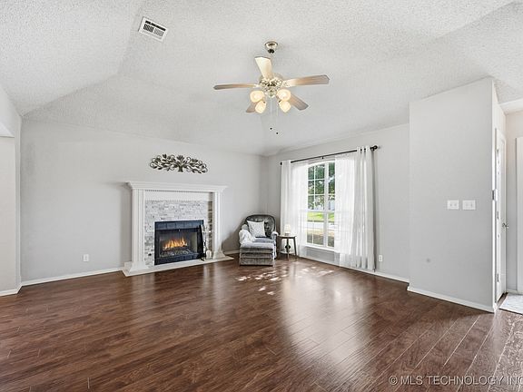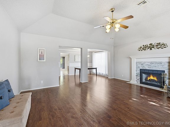 Former Builder's Model in Broken Arrow Schools! Beautifully maintained 3 bed, 2 bath home with spacious kitchen, wooden cabinets, built-in pantry and kitchen nook. All appliances - Washer, Dryer & Fridge stay! Dining room with tray ceiling & crown molding. Vaulted living area features wood-look laminate flooring and cozy gas quartz stacked-stone fireplace. Master bedroom easily fits king size furiture. Jetted tub, separate shower and double sink vanity in master bath.