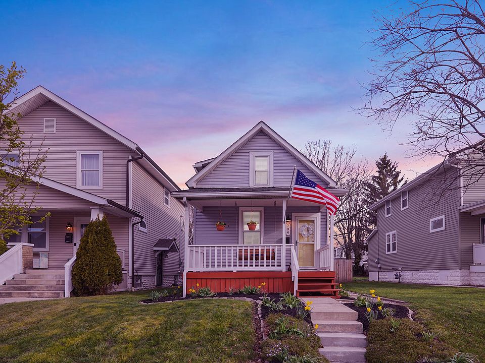 Cozy ''Southern Orchards'' Cape Cod home located just outside German Village, convenient to Nationwide Children's Hospital. Exceptionally clean and move-in ready! Front porch swing. Landscaped with perennials for years of beautiful flora. First Floor includes Living Room, Dining Room, Kitchen (quartzite counter-tops & breakfast bar, stainless appliances, gas range, sizeable custom-built pantry) and FULL bath. Second floor primary bedroom features two closets, additional storage drawer unit, and large ensuite full bath with laundry (washer & dryer convey). Second bedroom. Front & side porches, fully fenced back yard with patio, 3+ off-street parking spaces in rear. Updates in Documents.