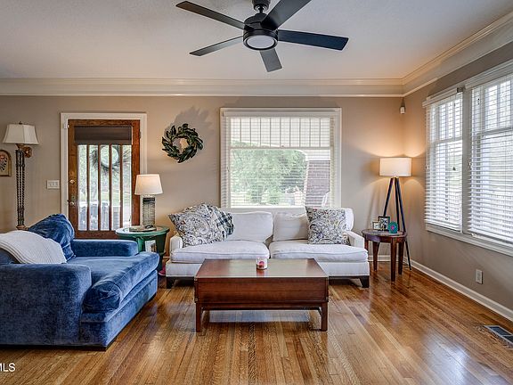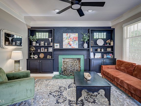 Light-filled living room with gas-log fireplace, custom built-ins, and large windows—a cozy yet elegant focal point.