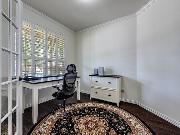 Highly sought after 1 story home with 2 living spaces, 3 bedrooms, office and 2 baths. The brick porch and decorative front door greet you on arrival. Entryway opens to private office with French doors. Engineered hardwood floors flow through common areas. The center part of the home opens to the living room, kitchen and dining area. The kitchen features granite counter tops, stainless appliances, large island, gas cooktop, HUGE walk in pantry and recently painted cabinets. The living room overlooks the back yard and offers a floor to ceiling stone fireplace to keep you cozy on chilly nights. A pocket office off the kitchen is the perfect option for homework or extra desk space. The primary bedroom is separated from the secondary bedrooms for privacy. The ensuite bath has TWO walk in closets, granite counter tops, dual sinks and separate jetted tub and large shower. Two secondary bedrooms with recent carpet, a secondary bathroom and an additional flex room can be found just off the living area. Utility room and mud room bench are located next to the garage entry. The utility room has a sink, hanging rod, cabinets and full sized washer and dryer hook ups. This home offers extra storage space too. The backyard with oversized covered patio has plenty of room for entertaining, play or pets.