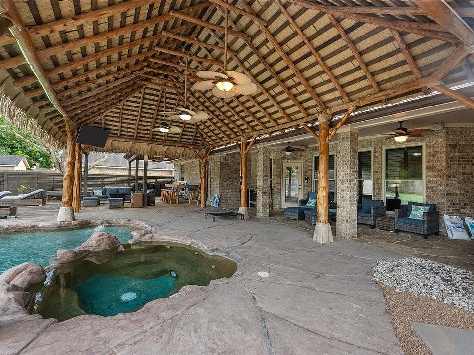 From the dramatic waterfall saltwater pool and spa to the private guest suite, every detail blends upscale comfort with smart, resort-style living. Recent upgrades include a new roof (2024), storm-impact windows, synthetic palapas, and water-resistant flooring throughout. Inside, you’ll find soaring ceilings, a chef’s kitchen, a media room with projector and Murphy bed, and smart features like central vacuum, whole-home audio, and remote security.