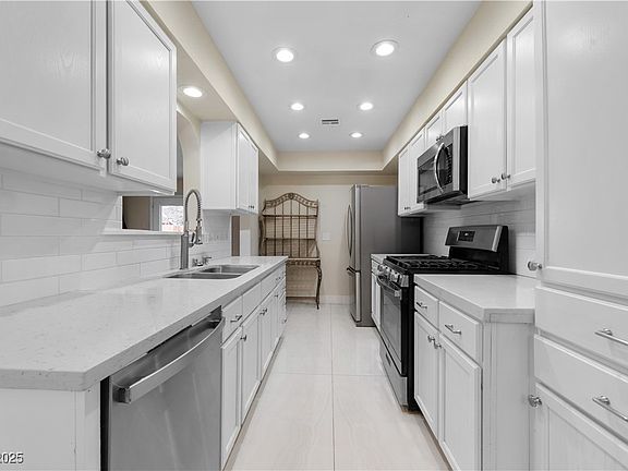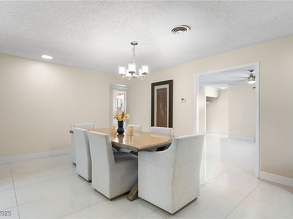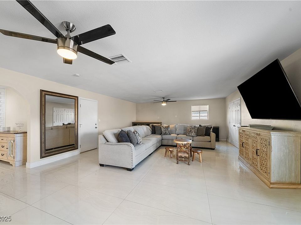 Single story 4 bedroom, 2 bathroom home with 2 car garage and no HOA! Enter home to living room with tiled flooring and ceiling fans. Kitchen has stainless steel appliances (refrigerator, stove, microwave, and dishwasher), subway tile backsplash, and quartz countertops. Dining area has fireplace. Primary bathroom has upgraded tiled shower and vanity. Guest bathroom also has upgraded tiled shower and vanity. Backyard has covered patio.