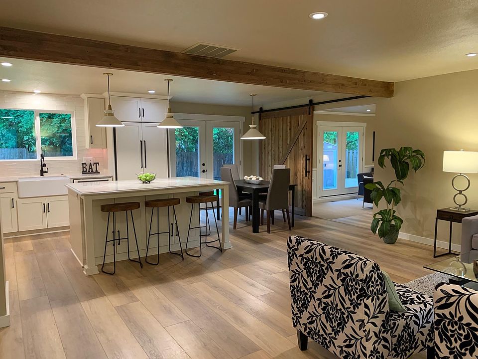 - Exterior features: Barn Doors Throughout, Designer Lighting, Eating Bar, Fire Pit, Frameless Glass Shower, French Doors, Kitchen Island, LVP Flooring, Landscaping included in rent, Lawn, No Utilities included in rent, Slab Granite Countertops, Stainless Appliances, Storage Shed, Undercabinet Lighting