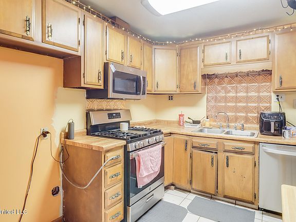 Inside, you'll find a spacious open-concept layout combining the kitchen and dining area — perfect for entertaining or everyday living. The kitchen boasts warm wood cabinetry, ample storage, a decorative copper-style backsplash, and stainless-steel appliances. The adjacent dining room provides plenty of room for gatherings, with natural light and tile flooring for easy maintenance.