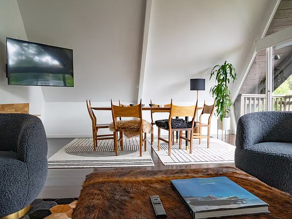 Our living room is spacious with plenty of seating options. Leather U-shaped sofa inspired by the early case-study of Milo Baughman. Glance over the trees and ravine at 2 more Boathouses. Hear the chirping of birds and enjoy the sights of nature from our balcony. To the left you'll see peek-a-boo city lights of Universal City and the San Fernando Valley.