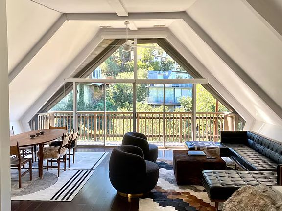 This is your chance to live in one of the iconic architectural gems designed by Harry Gesner! Lovingly called, "The Boathouse", this is a unique A-frame home that "floats" in the Hollywood Hills. Two bedrooms, one bathroom and an elevated meditation, reading platform. Styled with a nod to mid-century, surrounded by floor to ceiling windows in the living room and main bedroom. You'll love staying in this light-filled, super-special, funky-vibe Hollywood Hills home.
