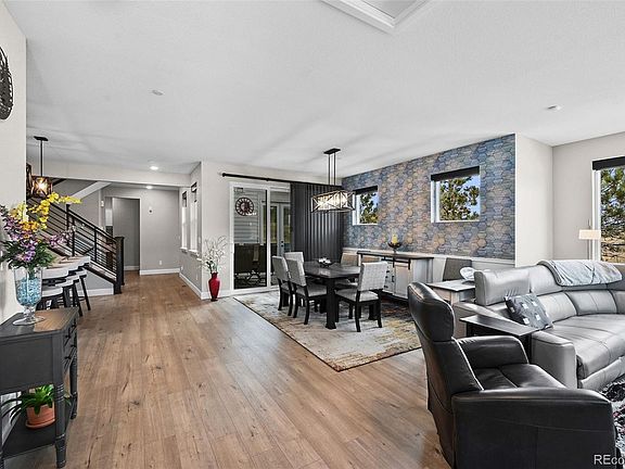 Imagine stepping out your front door and strolling to Danielle’s Scratch Kitchen, Trestles Coastal Cuisine, local coffee shops, Tony’s Meat Market, Woodhouse Spa, and charming boutiques and salons. Yes—it’s all just steps away. This stunning custom paired home in the exclusive, gated community of Castle Pines Village blends modern luxury with Colorado’s natural beauty. Built in 2021 and filled with thoughtful upgrades, this 3,758 sq ft home offers 4 bedrooms, 5 baths, and rare privacy backing to a peaceful greenbelt with rolling hills and mature trees. The light-filled open floorplan features a wall of windows overlooking the serene setting. The gourmet kitchen boasts a large slab-granite island, custom cabinetry, designer hood, tile backsplash, and premium stainless appliances. The great room impresses with a floor-to-ceiling tiled fireplace with a custom wood mantel. Wide-plank wood floors, custom lighting, and iron-railed staircases elevate the space throughout the main level, upper level, and finished basement.