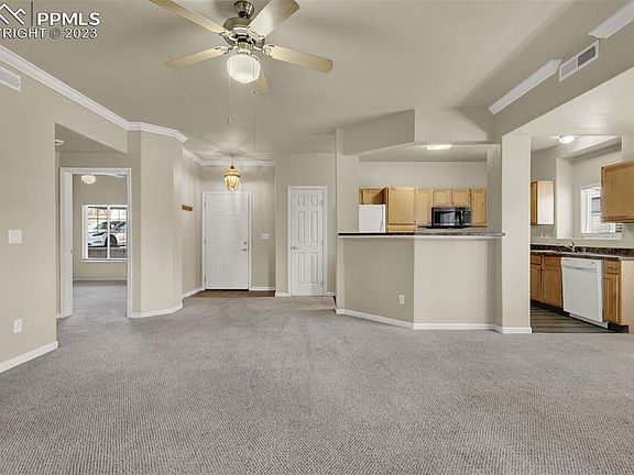This warm and inviting condo features an open floor concept, large rooms with ample closet space, and a gas fireplace in the living room, which is perfect for the cooler Colorado nights. The covered patio is also a great feature for enjoying the beautiful Colorado scenery. Additionally, access to a pool and spa is a great perk for residents of the gated community. It's good to know that the condo is located near shopping centers, a golf course, and parks, and provides easy access to local military bases. It's important to consider the amenities and location that are important to you when choosing a property. Lastly, checking what's included in the HOA dues is always a good idea to ensure that you're aware of any additional costs or benefits associated with the property. This home is a great opportunity to own a move-in ready home in a convenient location.