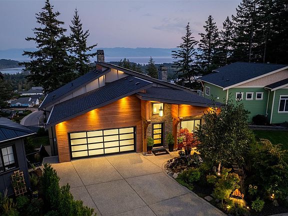 Custom-built in 2022, this 3,000+ sq. ft. executive home captures sweeping views of the Olympic Mountains & Strait of Juan de Fuca. Flooded with natural light from skylights & multi-slide glass doors, it offers seamless indoor-outdoor living. The open-concept living space w/vaulted ceilings features a gourmet kitchen w/ oversized granite island, high-end appliances & wine fridge, flowing into dining-living spaces & a view deck w/ custom wood-burning fireplace. With 5 bdrms , 4 baths including a self-contained 1-bdrm ocean-view suite w/private entrance & superior soundproofing, the home suits families, guests or rental income. Designed for sustainability, it boasts 23 solar panels, wiring for 2 EV chargers & ductless heat pump system. Meticulously landscaped grounds w/ water feature, raised gardens & privacy hedge, backing onto green space for tranquility yet just minutes from amenities. Perfect for soaking in sunsets or entertaining, this residence embodies the West Coast lifestyle.
