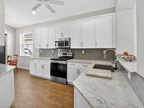 RARE UPDATED home in this price range! Major UPDATES include kitchen cabinets, quartz counter tops , wood-grain ceramic flooring, new vanities, frameless shower, garage storage, AC 2025 and Water Heater 2023. 2 walk-in closets, storm shutters. Vizcaya is pet friendly too. Enjoy the expanded, screened/covered patio while entertaining. Cable, internet, exterior painting (Oct 2025), roof maintenance, and landscaping are included in the low monthly HOA fees of $485. Roads paved in 2023. At the clubhouse, you'll find pickleball, tennis, heated pool, bocce ball, card rooms, fitness center and more. This is a 55+ gated community on Atlantic Ave close to places of worship, shopping, theater, nightlife, and easy access to the FL Turnpike and I95!
