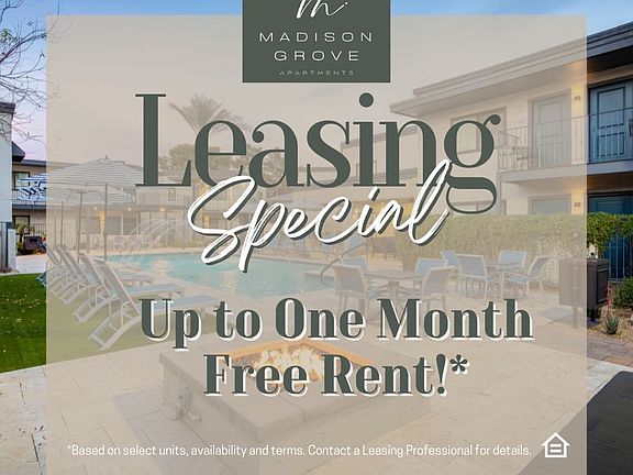 Welcome to Madison Grove apartments located in North Phoenix, AZ, situated between Piestewa Peak Park and Scottsdale. Madison Grove offers four different floor plans so you can find the perfect fit for you. All apartments are equipped with energy-efficient windows, stainless-steel appliances, quartz countertops, hardwood floors, an electronic thermostat. Outside your home awaits more amenities designed with your comfort and convenience in mind. Unwind after work in our state-of-the-art fitness center or in our resort-style pool. Relax in the evening by our fire pits or walk with your four-legged family member to our bark park. Madison Grove is conveniently located on 7th Street. Be minutes away from restaurant row, shopping, and parks. Enjoy all the fun and excitement our city has to offer in downtown Phoenix, uptown Phoenix, Biltmore, and Melrose District.