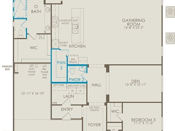 Spacious single-level Parklane plan with 3 beds, 2.5 baths, and open den. Chef's kitchen features gas cooktop and granite counters, overlooking the gathering room and café. Owner's suite is extended with a low-threshold glass walk-in shower, split from secondary bedrooms. Elevated homesite with North/South exposure and scenic views throughout the community.