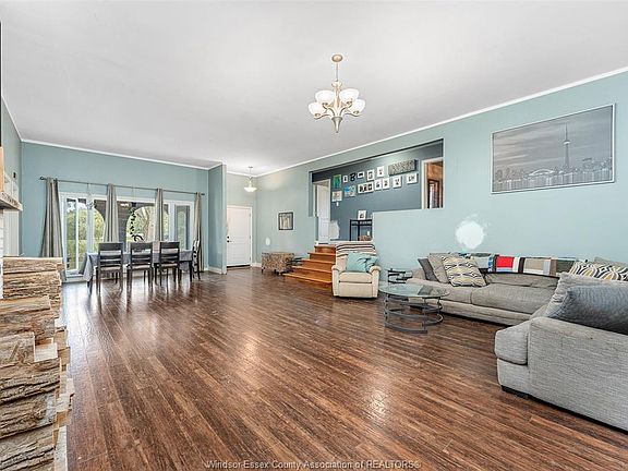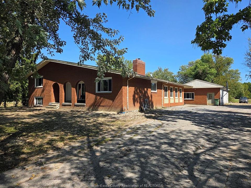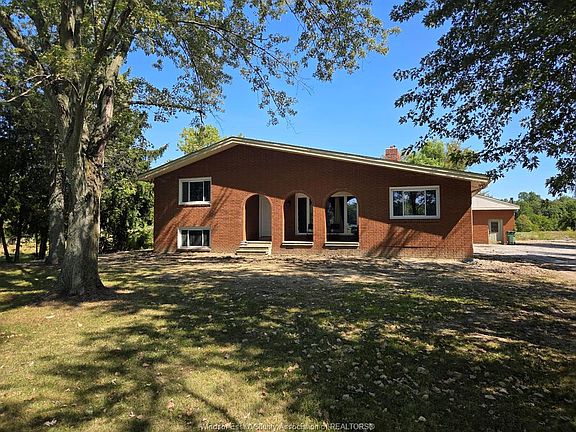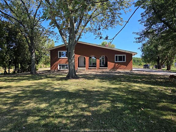 Country living in a great central location with this oversized full brick spilt level, tons of potential here! A unique 4-level on 5.069 acres minutes to Harrow, Essex & McGregor also 20 minutes to Windsor. Approx. 2500 SQFT on 2 levels plus 200 SQFT breezeway mud room with 16 FT patio doors leading to large concrete patio & walk through to a 55 FT x 22 FT Block Garage with Double auto doors. TONS OF POTENTIAL FOR MANCAVE / WORKSHOP with additional 150 SQFT side structure with rough-in for bathroom connected to Arobic septic system currently operating by gravity flow only (service to be completed prior to close). Large rear gravel parking area off of the garage. High 3rd level with approx. 720 SQFT roughed in for 2 bedroom apartment w/ private grade entrance. Huge living / dining room w/ natural fireplace and 10 FT ceilings. Covered front porch, hardwired (6) camera system, 200 Amp. Updates include reinforcement and outside waterproofing of several basement wall areas (2022), sections of the south garage walls underpinned (2000), Furnace , A/C & On demand Hot Water (2021), roofs (2015), most windows & doors (2017). Spacious master bedroom w/ sliding patio doors to rear.