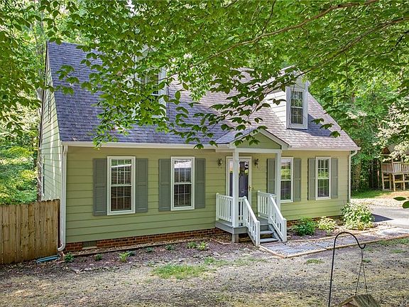 Adorable! Move right in to this super-cute cape with a 1/2 acre private, wooded oasis! Bright, sunny kitchen w/beadboard back splash and SS appliances. Lovely eat-in area by the bay window features a built-in bench w/storage. Cozy family room w/wood-look laminate floor and wood blinds. 2 nice bedrooms downstairs w/ a tiled full bath. Upstairs, 2 more large bedrooms have nice closets and access to eave storage. There's built-in shelving and a reading nook! Extend your living space on the HUGE multi-tiered party deck! Awesome space for entertaining or soaking in the tranquility of the private, park-like lot with a lovely view of the creek. Rear yard provides ample room to play and explore! Room for all of your toys and tools in attached shed + BIG detached shed. Awesome neighborhood, great schools, close to shopping, restaurants and highway. Make this charming house your home!