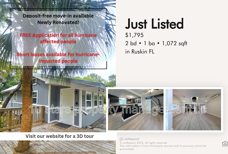 FOR SALE OR FOR RENT Beautiful 2 beds 1 bath is available for rent in Ruskin, FL Around 705 10th Street Southwest, Ruskin, an array of attractions and conveniences await exploration. Just a short distance away, E.G. Simmons Park offers waterfront views, fishing piers, picnic spots, and nature trails, perfect for outdoor activities and family outings. Nearby, the SouthShore Regional Library provides a space for learning and community engagement. For those seeking outdoor adventures, Little Manatee River State Park boasts hiking trails, canoeing opportunities, and serene natural surroundings. Accessible via Shell Point Road and US Highway 41, this area offers a mix of outdoor recreation, educational resources, and natural beauty for residents and visitors alike. 3D Tour Available: Features: - Short leases available for hurricane-impacted people (Case by Case situations) - Application fee will be credited back on the 1st month of rent if approved - Fresh remodel with ample space and storage - Spacious open-concept layout - Stainless steel kitchen appliances - Dishwasher included for convenience - Charming kitchen bar counter, perfect for casual dining or entertaining guests - Vinyl floors throughout for easy maintenance - Loft space for added versatility - Ceiling fans for enhanced comfort - Laundry room for convenient on-site laundry - Fenced yard perfect for outdoor relaxation and gatherings - Shed for extra storage for all your outdoor tools and equipment - Tenant is responsible for paying all utilities and lawn care Pets are allowed. No more than 2 pets per property. Weight limit of 55lbs per pet. No aggressive breeds. Applicants must complete a free pet application and have animal approved with vaccination record. The monthly pet fee will be determined by your pet screening score. Does not apply to medically/emotional support prescribed and/or service animals. At 10 Stars, we offer multiple services to make your stay with us easy and comfortable. We have a same-day application approval and a quick move-in for no additional cost. Our team is professionally trained and will be able to assist with any leasing, billing, or maintenance issues our tenants have. We also offer an emergency line available 24/7 for any urgent cases. Tenants have access to an online portal where they can make rent payments, communicate with our team and get updates on their payments and maintenance requests at all times. THE FIRST MONTH AND SECURITY DEPOSIT ARE REQUIRED We do offer a DEPOSIT FREE MOVE IN option and a TENANT BENEFIT PACKAGE that includes: rebuilding your credit feature, cash back rewards, online portal access and free concierge service! Renter's insurance is required prior to moving in. Rules and Regulations are on our website! Only $65 non-refundable application fee per adult with 10 stars property management