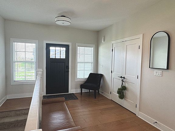 Inside, the main level features hardwood flooring throughout and large windows that bring in plenty of natural light. The kitchen includes a walk-in pantry and connects directly to a mudroom and laundry area just off the garage, making daily routines simple and organized. The living area is open and comfortable, designed for functionality and easy flow.