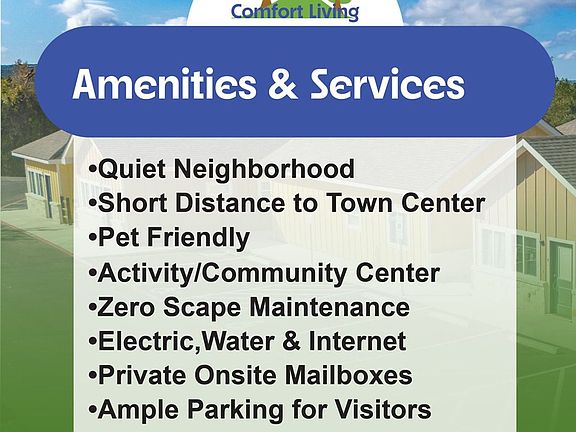 Comfort Living offers Independent Housing for Seniors for a low-maintenance lifestyle in quiet country bungalows. Monthly rent includes electric, water, sewer, trash, internet, and twice monthly cleaning. Additional benefits include: Activity/Community Center, Private On-Site Mailboxes, Ample Parking for Visitors, Pet Friendly, Quiet Neighborhood, ADA Compliant, 24 Hours Emergency Number.