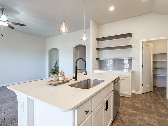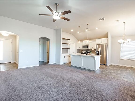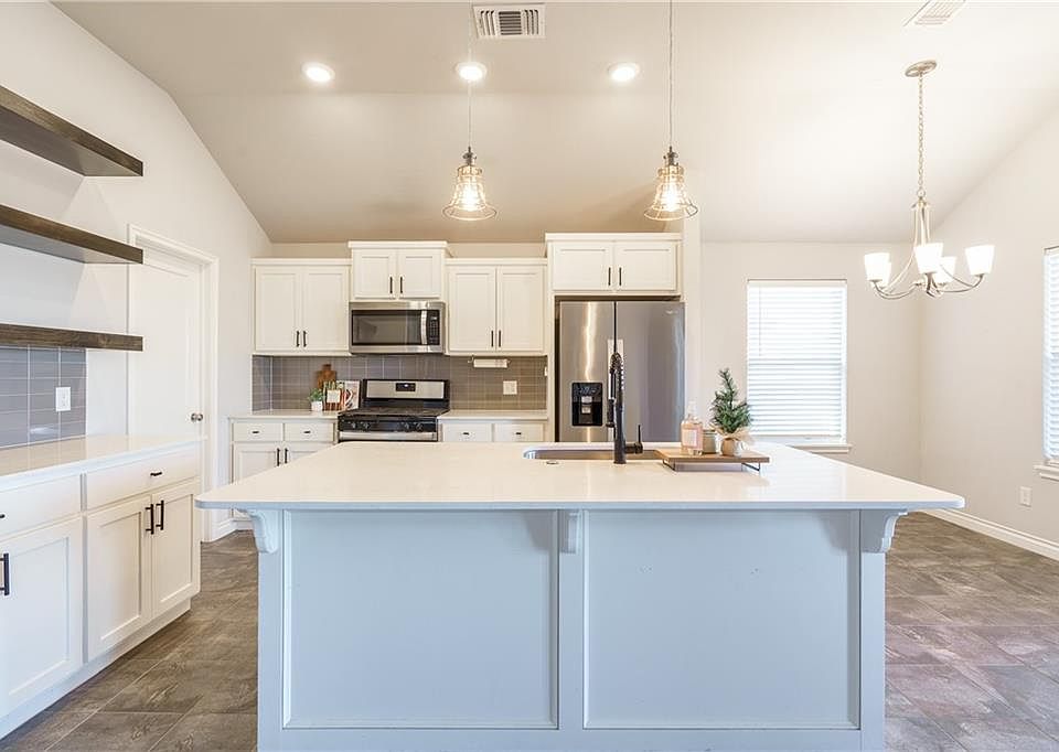 Beautiful modern/contemporary home with an open concept living area that includes a stunning white kitchen with stainless steel appliances and quartz countertops with a tile backsplash and breakfast bar. 3 bedrooms, 2 bathrooms, mudroom, 2 car garage with a storm shelter! The large backyard includes a covered patio with views in the distance of the Devan tower. You can even see the Norman firework display in July! The neighborhood includes a park just down the street from the home and walking trails to the pond as well as a splash pad to enjoy in the summer. You don't want to miss out on this charming home!