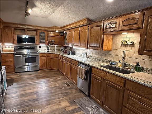 Situated on a corner lot just up the hill from Heavener High School, this charming two-bedroom, two-bath home features a large kitchen with abundant storage, a generous laundry room with a sink, and custom oak shelving and cabinets in the office area. Enjoy outdoor living on the expansive deck and stone patio.