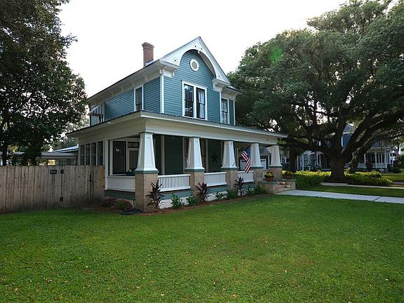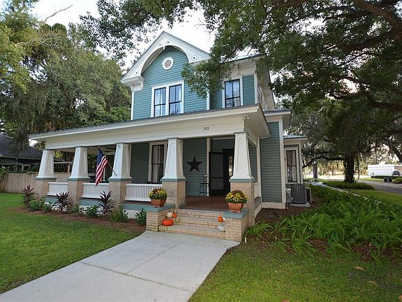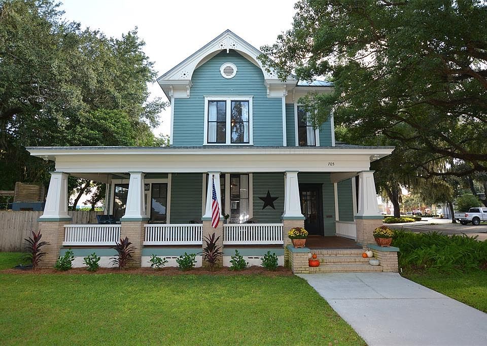 You must see this stunning 4 bedroom 3 bathroom home located in the heart of Bartow’s historic district. This 1898 home is one of the oldest houses in Bartow boasting 3,124 sqft of living area, 11ft high ceilings, crown molding, hardwood floors, built in bookshelves, exposed wood ceiling beams in living room, sun room, formal dining room, wood molding staircase, oak floors downstairs, pine floors upstairs, updated upstairs bathroom with glass shower doors, new A/C unit upstairs, large guest bedrooms, new ceiling fans, giant front porch, metal roof with new screws, new flat roof over carport, new carport floor paint, and a transferable termite bond. This home has large windows offering tons of natural light and incredible views of the courtyard and other surrounding historic homes. The spacious kitchen has recently been updated to include the conveniences of modern life with quartz countertops, stainless appliances, deep farmhouse sink, butlers pantry, and gas range. The ground floor master suite has a completely updated bathroom with walk in glass shower enclosure, walk in closet, shiplap walls, subway tiles, and dual sinks. The living room and family room areas are divided by double sided wood burning fireplaces. The sun room that overlooks the large sweeping front porch could easily be used as a fifth bedroom if needed. The home sits on a huge .34 acre corner lot in the middle of charming Bartow's Main Street District which offers restaurants, community events, and historic sites including the Polk County courthouse. Enjoy relaxing and entertaining outside with mature shady oaks, a large fire pit, brick patio, custom playhouse with climbing wall and swing-set, wood privacy fence, long driveway, double gate, rebuilt detached garage, new wood decking on front porch, workshop, and two car carport. The home is conveniently located to several shopping centers, grocery stores, restaurants, parks, Polk State College, and the Polk Parkway for easy commutes to Tampa and Orlando.