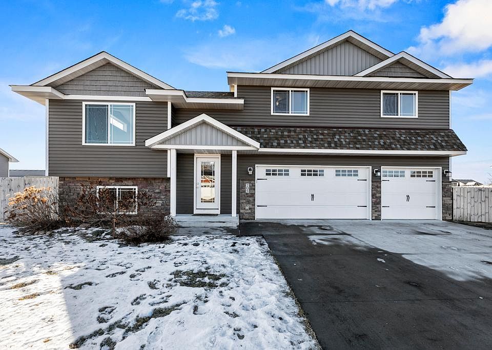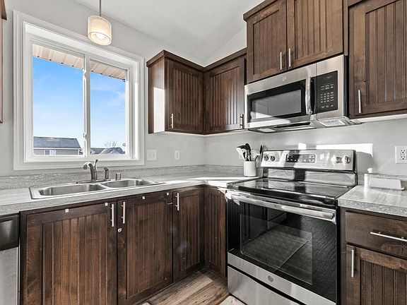 Experience the perfect blend of comfort and style in this thoughtfully designed home! All three bedrooms and two bathrooms are conveniently located on the same level for ease and functionality. The open main level floorplan features soaring vaulted ceilings and a private owner’s suite complete with a full bathroom, double sinks, and a spacious walk-in closet. Gorgeous finishes shine throughout, from the crisp white enameled woodwork to the rich walnut-stained cabinetry. The kitchen is a chef's dream with a pantry, stainless steel appliances, and a versatile snack bar. The oversized garage is a standout, fully insulated and heated—ready for any project or extra storage needs. This home is a true gem! The finished basement also includes a rough in for an additional bath and even an in wall gun safe. You'll love the solar on the rear roof line too help keep those energy costs down! NEW carpet on the stairs as well and lots of new paint throughout really help this home shine! Looking for a large backyard with privacy fencing? We got it! Set your showing today!