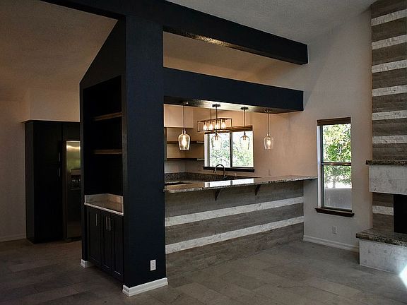A standout feature of this home is the custom masonry work using split-face natural stone, showcasing craftsmanship rarely seen in recent renovations. The fireplace immediately draws the eye with its modern vertical layout and layered stonework, creating a warm and sophisticated focal point in the living space. This same high-end masonry continues beneath the raised kitchen counter, providing visual continuity and elevating the overall design. The result is a space that feels intentional, elevated, and truly one-of-a-kind, blending artistry with functionality.