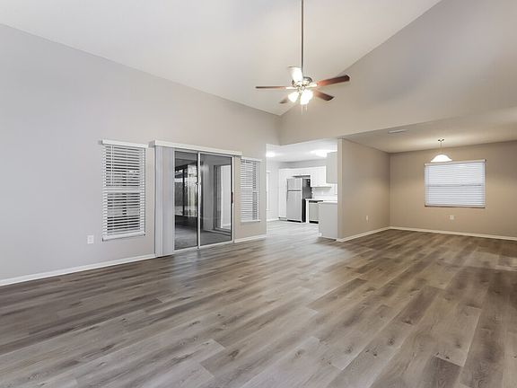 High vaulted ceilingLighted ceiling fanHardwood flooringL-shaped kitchenStainless steel appliancesWalk-in closet