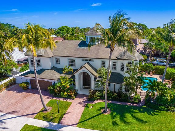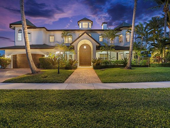 Welcome to this exceptional waterfront residence nestled in the heart of Jupiter! This bespoke CBS home boasts 135 feet of waterfrontage and is brimming with distinctive charm. Step inside and be greeted by the grandeur of the mahogany front doors, once gracing a 1929 Palm Beach Estate. Revel in the architectural delights such as the exquisite, coffered ceiling in the living area, a dual-sided fireplace connecting the kitchen and living room, and the striking wrought iron stairwell complemented by Brazilian walnut stairs and flooring on the second level.The well-appointed kitchen showcases brand new appliances and a picturesque window offering views of the fully fenced tropical yard. See more remarks.... Outside, the pavered patio and pool area, complete with WiFi-enabled outdoor landscape lighting, provides an inviting space for al fresco dining and relaxation. The property features a new seawall installed in 2018, spanning 120 feet with concrete and vinyl sheeting, a 10,000 lb High-Tech boat lift, a floating dock, and easy access to the sandbar and Jupiter Inlet.