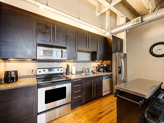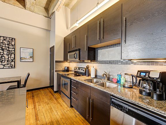 Relax in the oversized jacuzzi tub or unwind upstairs on the building's rooftop patio with skyline views and a grill. Other building amenities include a small gym, community lounge with pool table, and secure, access-controlled entry with concierge.