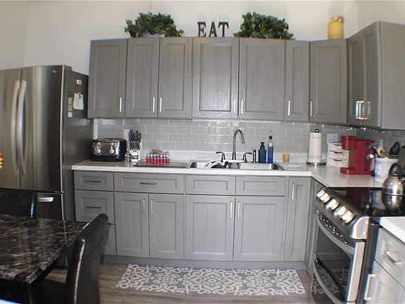 Original woodworkSide kitchen porchPlenty of storagePrivate covered front porchLovely shade of lavenderChic grey cabinetryBig bright windows